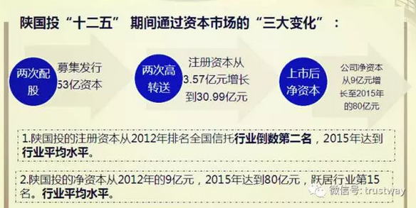 “2012年的時(shí)候,陜國(guó)投3.57億元的注冊(cè)資本在行業(yè)排名倒數(shù)第三?!毖久窀锌溃?015年,公司繼續(xù)把握住了資本市場(chǎng)階段性機(jī)會(huì),完成了“十二五”時(shí)期的第二次增資擴(kuò)股,募集資本32億元,再次實(shí)施十送十,使公司注冊(cè)資本達(dá)到了30.9億元,凈資產(chǎn)達(dá)到80億元,資本實(shí)力進(jìn)入行業(yè)第一梯隊(duì)。