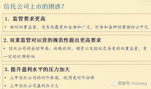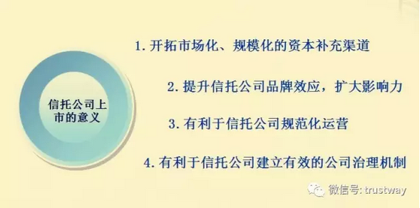 他認(rèn)為,對(duì)于信托公司來(lái)說(shuō),上市不僅可以為信托公司開(kāi)拓市場(chǎng)化、規(guī)范化的資本充足渠道,還可以提升品牌效應(yīng)擴(kuò)大影響力,以及規(guī)范運(yùn)營(yíng)和建立有效治理機(jī)制。