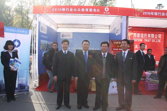 薛季民董事長參加了當天的啟動儀式,并代表省內(nèi)3家信托公司接受了陜西電視臺等新聞媒體的采訪。陜西銀監(jiān)局李建華局長、西安市副市長金學(xué)峰、陜西證監(jiān)局局長助理孔兵等領(lǐng)導(dǎo)到我公司宣傳服務(wù)工作臺前視察指導(dǎo)工作。