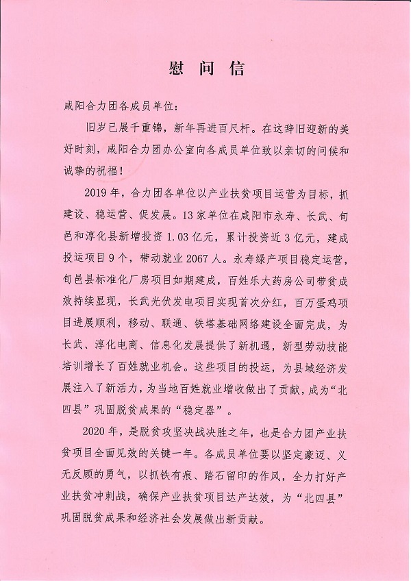 1月22日,省國資委咸陽合力團(tuán)辦公室向公司黨委發(fā)來慰問信,為公司一年來在淳化縣產(chǎn)業(yè)脫貧工作中的突出貢獻(xiàn)表示衷心感謝!