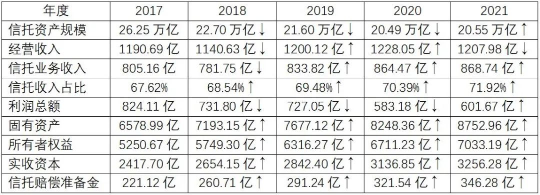 表一 2017-2021年信托業(yè)規(guī)模、業(yè)績和資本變化一覽表