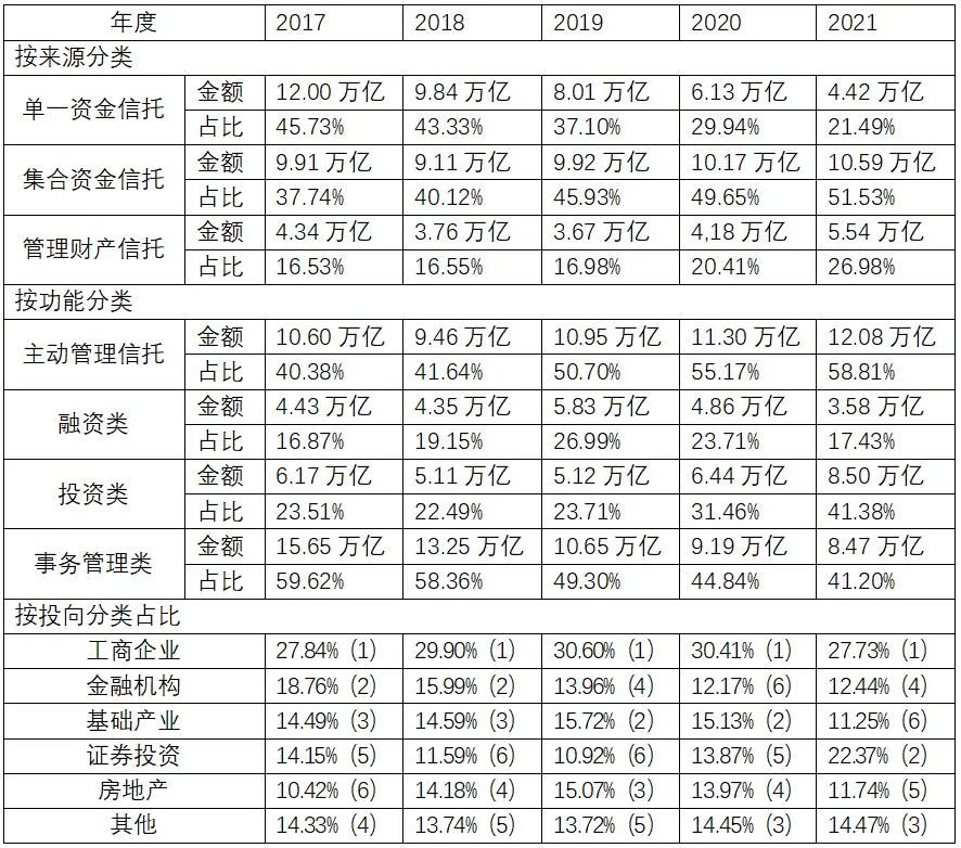 表二 2017-2021年信托業(yè)務結構變化一覽