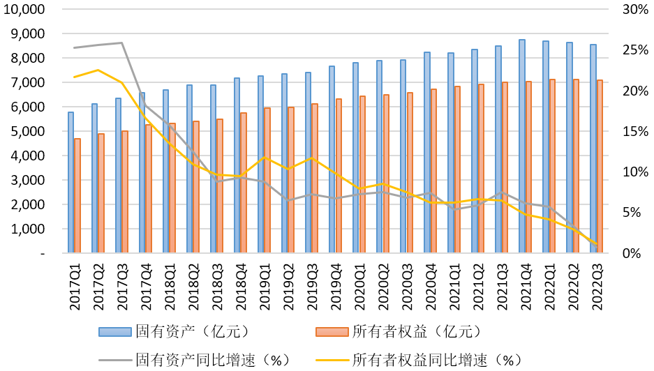 一是行業(yè)資本實(shí)力保持穩(wěn)定。從固有資產(chǎn)總額來看,3季度末達(dá)到了8562.88億元,同比略增59.32億元,增幅0.70%;環(huán)比略有下降0.89%。從所有者權(quán)益總額來看,2022年3季度末達(dá)到了7087.25億元,同比增長81.18億元,增幅1.16%,環(huán)比下降0.56%。行業(yè)固有資產(chǎn)總額、所有者權(quán)益總額自2010年以來持續(xù)保持正增長,但從2021年3季度開始季度增速明顯回落,2022年3季度則進(jìn)一步收窄,且環(huán)比數(shù)據(jù)出現(xiàn)下滑,這也反映出當(dāng)前行業(yè)發(fā)展轉(zhuǎn)型過程中出現(xiàn)盈利能力下降導(dǎo)致資本積累減少、投資吸引力減弱導(dǎo)致增資活躍度降低等挑戰(zhàn)。