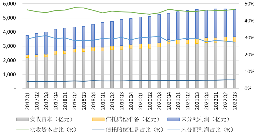 二是所有者權(quán)益內(nèi)部結(jié)構(gòu)基本保持穩(wěn)定。實(shí)收資本一直是所有者權(quán)益中最主要組成部分,截至2022年3季度末,全行業(yè)實(shí)收資本為3299.79億元,同比增長112.58億元,增幅3.53%,環(huán)比增長0.46%,在所有者權(quán)益中的占比達(dá)到了46.56%,同比提升1.07個(gè)百分點(diǎn)。3季度末未分配利潤達(dá)到1943.39億元,同比下降138.87億元,降幅6.67%,環(huán)比下降2.35%,與部分機(jī)構(gòu)通過未分配利潤轉(zhuǎn)增資本和現(xiàn)金分紅有關(guān),在所有者權(quán)益中占比27.42%,同比降低2.3個(gè)百分點(diǎn)。信托賠償準(zhǔn)備保持較快增長,3季度末規(guī)模為355.35億元,同比增長25.69億元,增幅7.79%,環(huán)比略降2.32%,在所有者權(quán)益中占比為5.01%,同比上升了0.31個(gè)百分點(diǎn)。