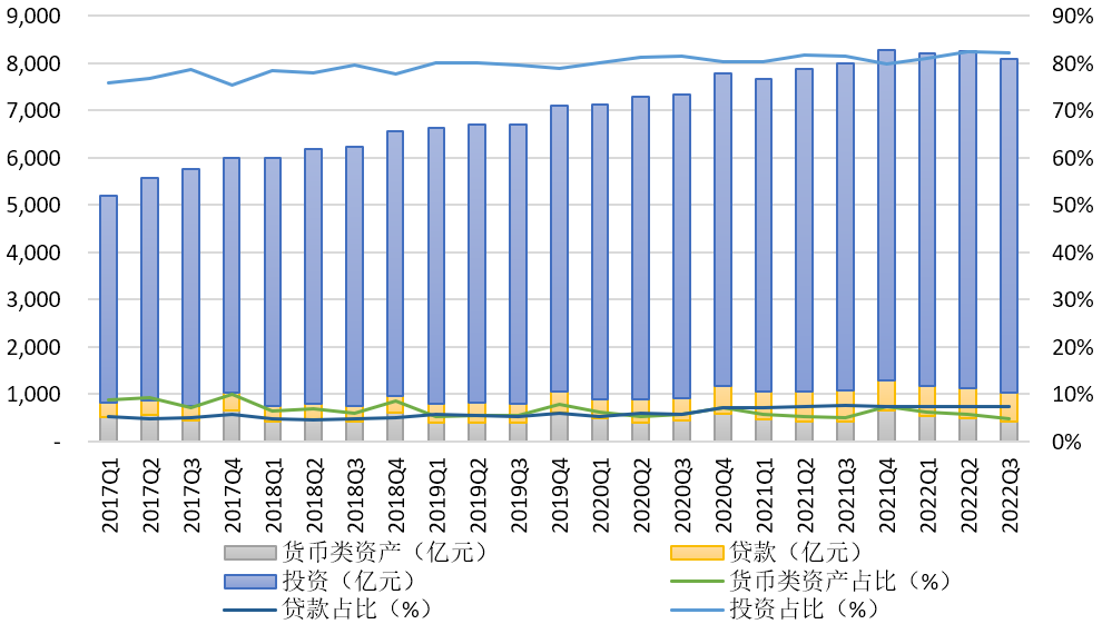 三是固有資產(chǎn)中投資運(yùn)用方式進(jìn)一步占據(jù)主導(dǎo)。2022年3季度末固有資產(chǎn)通過投資方式運(yùn)用的規(guī)模達(dá)到7041.78億元,同比增長108.76億元,增幅1.57%,環(huán)比降低1.06%,占比達(dá)到82.24%,同比進(jìn)一步提升0.71個(gè)百分點(diǎn),且2022年連續(xù)3個(gè)季度的占比均保持在80%以上。貸款方式運(yùn)作的規(guī)模為628.73億元,同比下降22.58億元,降幅3.47%,環(huán)比下降1.27%,占比為7.34%,同比略降0.32個(gè)百分點(diǎn),相對占比自2018年2季度跌至谷底以后總體保持小幅回升態(tài)勢。貨幣類資產(chǎn)規(guī)模為412.53億元,同比下降2.88%,環(huán)比下降16.40%,占比4.82%,同比略降0.18個(gè)百分點(diǎn),占比總體呈現(xiàn)持續(xù)下降態(tài)勢。