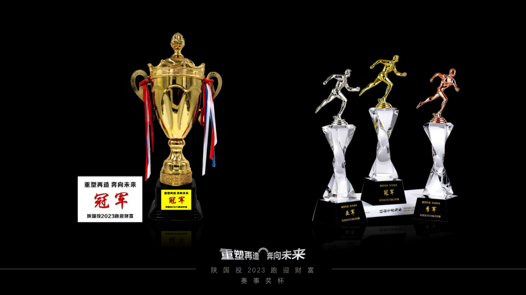 活動(dòng)分別設(shè)有團(tuán)隊(duì)冠亞季軍獎(jiǎng)杯及11km個(gè)人(男子/女子)冠亞季軍獎(jiǎng)杯,沉甸甸的獎(jiǎng)杯除了承托著勝利的喜悅,也凝聚了榜樣的力量。集體獎(jiǎng)杯主體設(shè)計(jì)為金色皇冠,象征著團(tuán)隊(duì)的榮耀;個(gè)人獎(jiǎng)杯主體設(shè)計(jì)為奔跑的人物形象,鼓勵(lì)參賽選手與陜國(guó)投一同在2023年奮勇向前,跑迎財(cái)富!